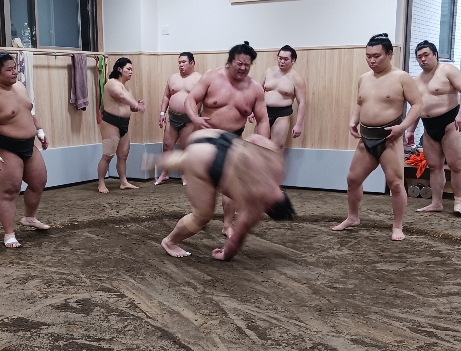 現在、高砂部屋の朝稽古は7時半開始です。新弟子を除いてはほとんどの力士が開始時間ギリギリになってから稽古場に下り回しを締めますが、朝乃山だけは7時前に稽古場の上り座敷でストレッチや体操で体をほぐし、誰よりも早く回しを締め、四股やすり足等の準備運動も手を緩めることなく行っています。誰しも体調の悪い日や日々のストレス、精神的な悩み等抱え、「今日は気乗りがしない」とか「少し体を休めよう」とか思う日があり、つい自分自身への言い訳をつくりがちですが、朝乃山は、この地味な鍛錬を、来る日も来る日も淡々と繰り返しています。また、元大関というプライドを捨てて、幕下以下の若い衆としての部屋の仕事も当たり前のようにこなしています。番付発表前に行われる土俵壊し(土俵を作り直すため掘り起こす作業)にも進んで参加し鍬を振い、ちょうど稽古見学に訪れた東京富山県人会の会員の方々も「貴重なものを見せてもらった」と驚き喜んでいました。